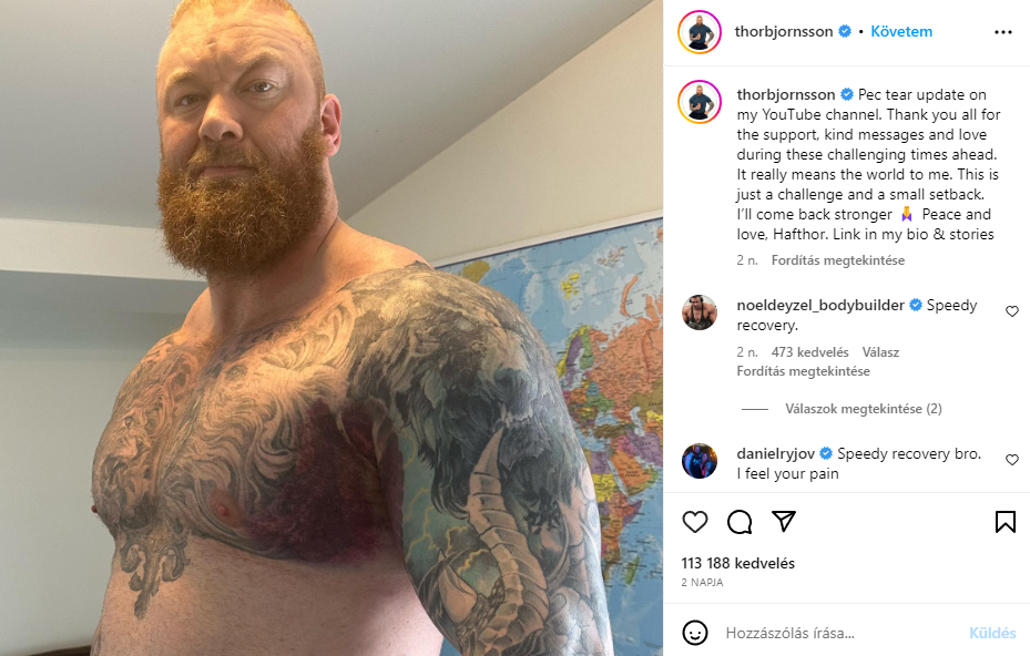 "Köszönöm mindenkinek a támogatást, a kedves üzeneteket és a szeretetet, amit ebben a nehéz időszakban kaptam" - mondta Hafþór Júlíus Björnsson. "Ez nagyon sokat jelent nekem. Ez csak egy nehézség és egy kis visszaesés. Erősebben fogok visszatérni" - írta a posztban. A képet a cikkünk galériájában láthatjátok.