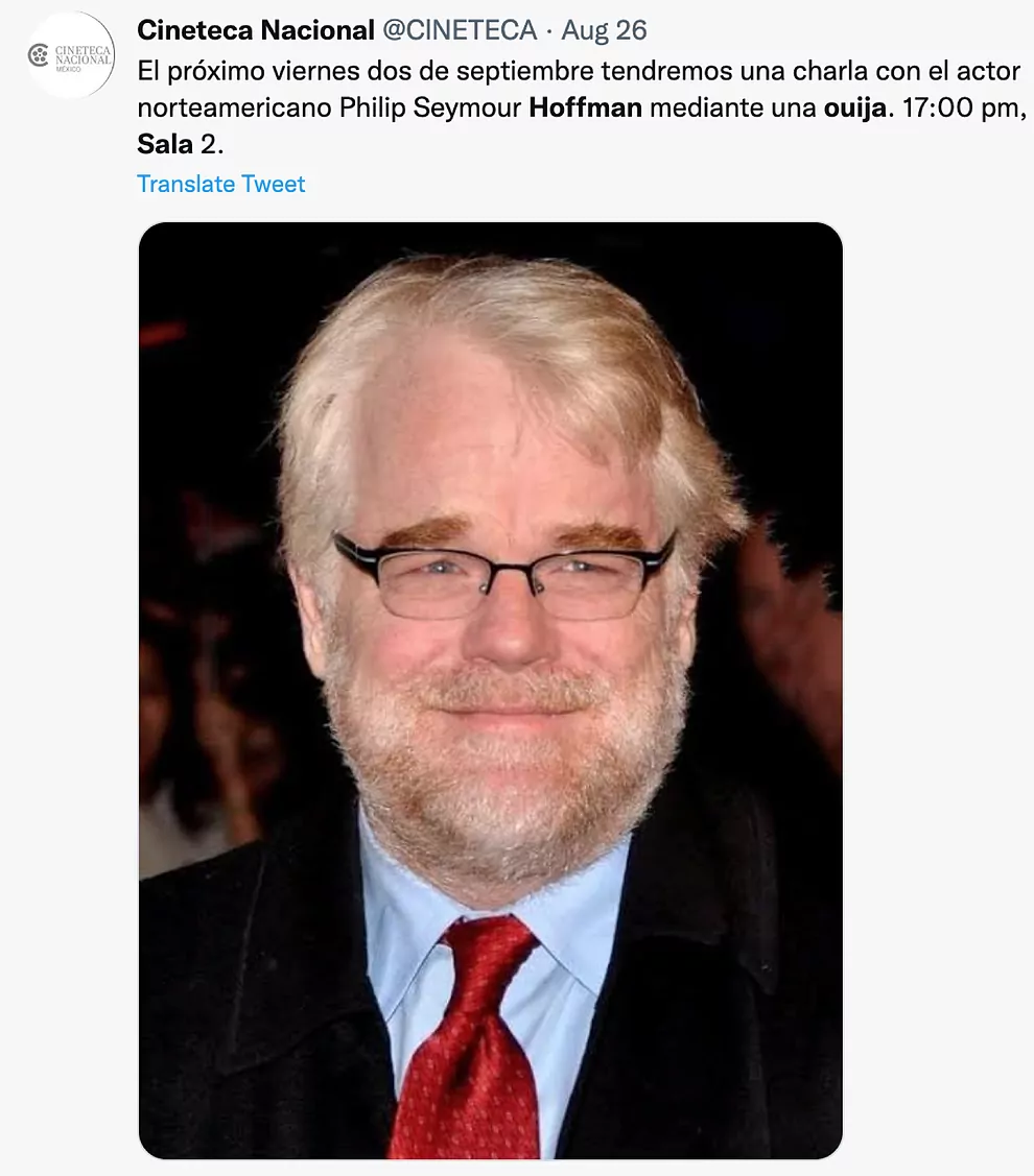 “Szeptember 2-án, pénteken, 17:00 órakor a 2-es teremben Philip Seymour Hoffman észak-amerikai színésszel beszélgetünk egy Ouija-tábla segítségével.”