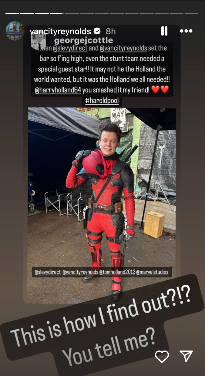 A bejegyzést később Reynolds tovább osztotta, amelyben meglepettségének adott hangot, miszerint ő maga sem tudott Harry Holland szerepléséről.
